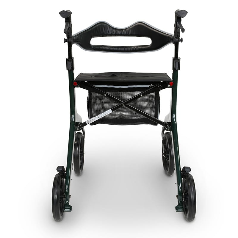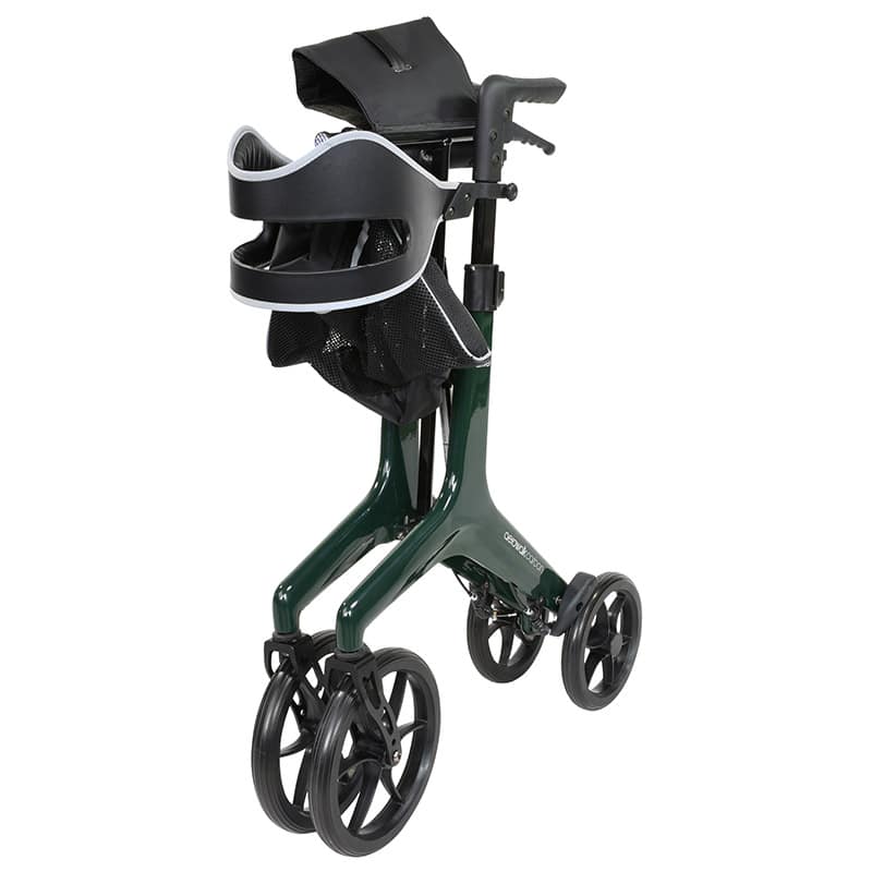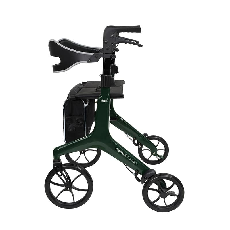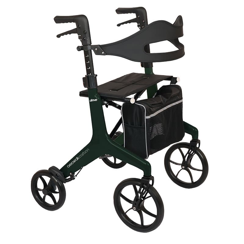 Aerowalk Carbon est un rollator ultra‑léger en fibre de carbone (4,6 kg*) qui allie élégance, maniabilité et confort au quotidien, avec une assise large rembourrée, une sangle dorsale sécurisée et un pliage compact pour un transport facile.